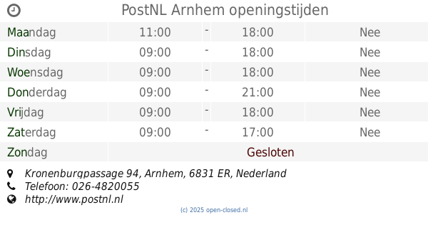 Het is ook mogelijk: Bewerk deze OPENINGSTIJDEN van Kantoor PostNL In Arnhem, Kronenburgpassage 94,